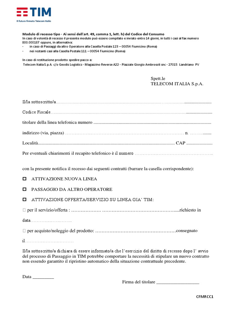 Lettera di Recesso Contratto Telefonico – Come Scrivere ... In questa sezione è possibile trovare un modello di lettera di recesso contratto telefonico editabile e compilabile da scaricare e stampare. Il fac simile recesso contratto telefonico presente è messo a disposizione in formato DOC, questo significa che il modulo può essere aperto e modificato utilizzando Word, per compilare la lettera ... Modulo Diritto di Ripensamento - Modelli e Fac Simile May 1, 2022 · Per la maggioranza dei contratti stipulati tramite telefono è previsto il diritto di ripensamento, ovvero, il diritto dell’utente di liberarsi dal vincolo contrattuale esprimendo la propria volontà ai diretti interessati nei giorni immediatamente successivi alla sottoscrizione del contratto. Disdetta contratto: il diritto di ripensamento - Controversie ... Feb 11, 2020 · Le modalità previste per l’esercizio del diritto di ripensamento sono indicate nelle condizioni generali di contratto sottoscritte. In linea di massima per esercitare il diritto di recesso è necessario inviare una raccomandata con ricevuta di ritorno all’operatore telefonico.